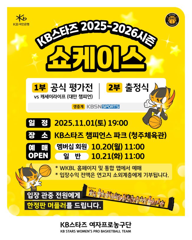 여자프로농구 KB국민은행이 새 시즌 개막을 앞두고 오는 11월1일 오후 7시 청주체육관에서 ‘2025∼2026시즌 쇼케이스(Show Case)’를 개최한다. 이번 쇼케이스는 KBS N 스포츠를 통해 전 일정이 생중계되며, 대만 리그 챔피언 ‘캐세이라이프’를 초청해 펼쳐지는 공식 평가전과 팬들과 함께하는 출정식으로 구성돼있다. KB는 이번 평가전을 통해 지난