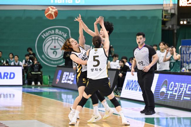 지난 20일 부천체육관에서 열린 하나은행과 KB스타즈의 시즌 2번째 맞대결에서 하나은행 박진영(오른쪽)을 KB스타즈 사키와 양지수가 더블팀 수비로 막으려 하고 있다. 사진제공=WKBL 여자농구 올스타 브레이크를 앞두고, 후반기 판도를 가를 흥미로운 대결이 준비된다. 올 시즌 양 강 구도를 형성하고 있는 하나은행과 KB스타즈가 그 맞대결의 주인공이다. 두 팀