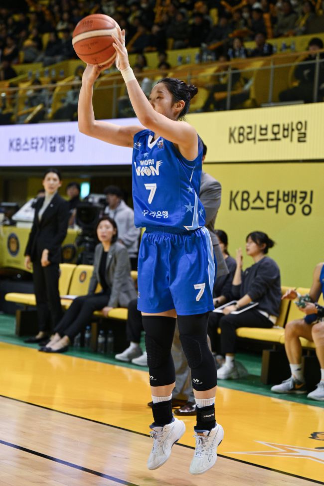 여자농구 우리은행 이민지가 27일 KB스타즈와 경기에서 3점슛을 쏘고 있다.(WKBL 제공) (서울=뉴스1) 서장원 기자 = 여자프로농구 아산 우리은행이 3점슛만 9개를 폭발시킨 이민지의 활약 속에 청주 KB스타즈를 누르고 2연패 탈출에 성공했다. 우리은행은 27일 청주체육관에서 열린 BNK금융 2025-26 여자프로농구 원정 경기에서 KB스타즈를 68-6