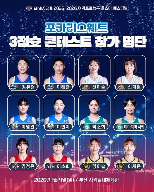 강이슬(31, KB스타즈)이 3점슛 여왕에 도전한다. WKBL(한국여자농구연맹)이 오는 2026년 1월 4일(일) 오후 2시 부산 사직실내체육관에서 열리는 ‘BNK금융 2025~2026 여자프로농구 올스타 페스티벌’에서 진행되는 ‘포카리스웨트 3점 슛 콘테스트’와 ‘스킬 챌린지’의 참가 명단을 확정했다. 포카리스웨트 3점 슛 콘테스트 예선은 제한 시간 60