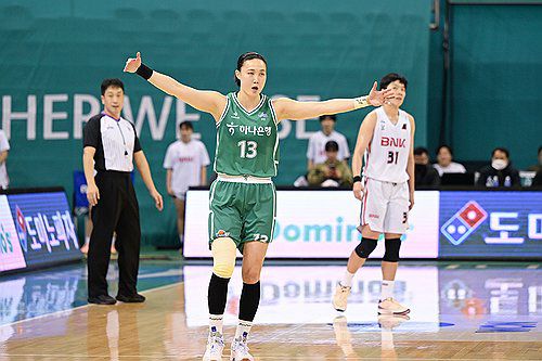 (서울=연합뉴스) 10일 부천실내체육관에서 열린 2023-2024 여자프로농구 부천 하나원큐와 부산 BNK의 경기. 하나원큐 김정은이 득점 후 환호하고 있다. 2023.12.10 [WKBL 제공. 재판매 및 DB 금지] photo@yna.co.kr ▶제보는 카카오톡 okjebo ▶연합뉴스 앱 지금 바로 다운받기~ ▶네이버 연합뉴스 채널 구독하기 <저작권자(