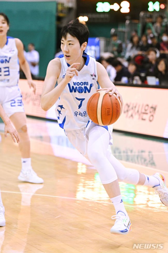 [서울=뉴시스]여자농구 우리은행 박혜진. (사진=WKBL 제공) [서울=뉴시스]안경남 기자 = 여자프로농구 아산 우리은행이 부천 하나원큐를 완파했다. 우리은행은 8일 아산 이순신체육관에서 열린 우리은행 우리WON 2023~2024 여자프로농구 정규리그 홈 경기에서 하나원큐에 77-64로 승리했다. 이로써 우리은행은 2위(19승5패)를 지켰다. 선두 청주 K