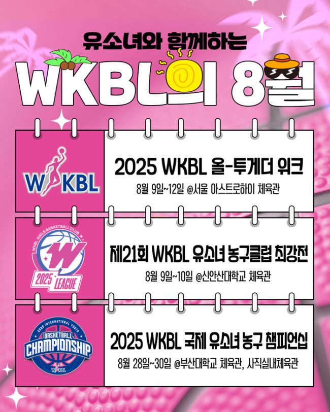 WKBL이 8월 유소녀 선수들과 함께 다양한 행사 및 대회를 개최한다. 사진 | WKBL 한국여자농구연맹(WKBL)이 다가오는 8월을 맞이해 WKBL의 미래인 유소녀 선수들과 함께 다양한 행사 및 대회를 개최한다. 8월9일부터 12일까지 서울특별시 중구에 있는 아스트로하이 체육관에서 ‘2025 WKBL 올-투게더 위크’가 열린다. WKBL이 새롭게 기획한