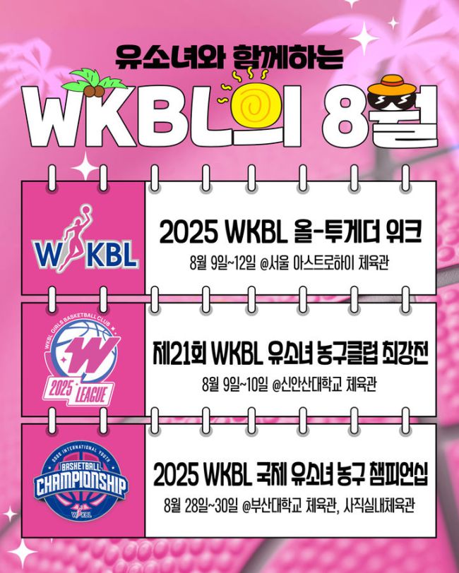 [서울=뉴시스] WKBL 8월 행사 이미지. (사진=WKBL 제공) *재판매 및 DB 금지 [서울=뉴시스] 김진엽 기자 = 한국여자농구연맹(WKBL)은 다가오는 8월을 맞이해 WKBL의 미래인 유소녀 선수들과 함께 다양한 행사 및 대회를 개최한다고 31일 밝혔다. 내달 9일부터 12일까지 서울 중구에 있는 아스트로하이 체육관에서 '2025 WKBL 올-투게