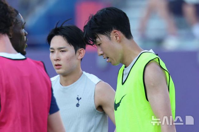 [안양=뉴시스] 권창회 기자 = 잉글랜드 프리미어리그 토트넘 홋스퍼 손흥민과 양민혁이 2일 경기 안양시 안양종합운동장에서 열린 2025 쿠팡플레이 시리즈 토트넘 오픈 트레이닝에서 훈련을 하고 있다. 2025.08.02. kch0523@newsis.com [서울=뉴시스] 하근수 기자 = 축구 국가대표 유망주 양민혁(19)이 잉글랜드 프로축구 프리미어리그(EP