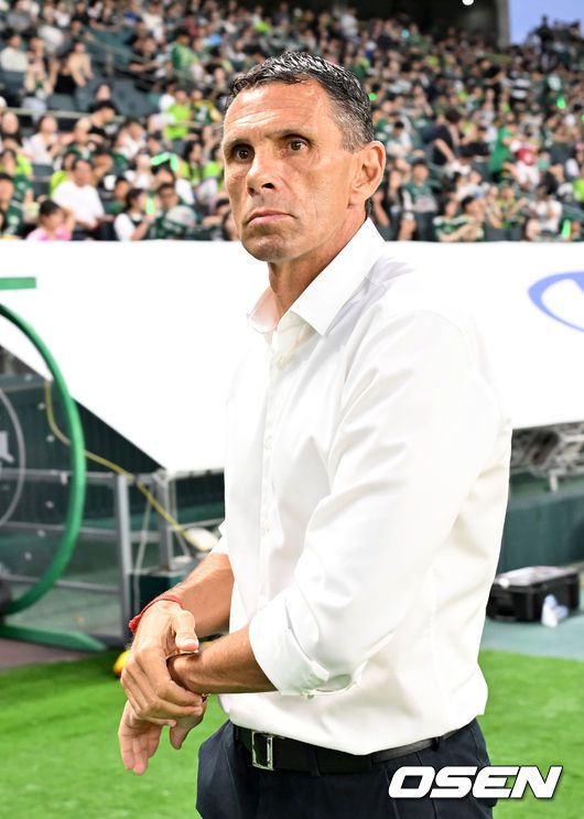 8일 오후 전주월드컵경기장에서 하나은행 K리그1 2025 25라운드 전북현대와 FC안양의 경기가 열렸다. 이 경기에서 전북은 박진섭의 선제골과 이승우의 결승골이 터져 FC안양을 2-1로 이겼다.무려 21경기 연속 무패(16승5무)를 달린 전북(17승6무2패, 승점 57점)은 압도적 선두를 지켰다. 전북 거스 포옛 감독이 그라운드를 바라보고 있다. 2025.