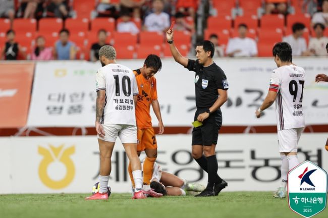 제주 김준하(가운데)가 15일 강원전에서 경고 누적으로 퇴장당하고 있다. 사진 | 한국프로축구연맹 제주SK와 강원FC가 승점 1씩 나눠가졌다. 제주와 강원은 15일 제주월드컵경기장에서 열린 ‘하나은행 K리그1 2025’ 26라운드 맞대결에서 득점 없이 0-0으로 비겼다. 제주(승점 30)와 강원(승점 32)은 순위도 그대로 8~9위를 유지했다. 제주는 전반