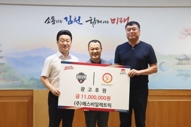 사진=김천 상무 제공 김천상무가 동희산업과 에스비일렉트릭의 후원금 전달식을 진행했다. 김천상무프로축구단이 지난 28일, 김천시청에서 (주)동희산업과 (주)에스비일렉트릭의 후원금 전달식을 진행했다. 행사에는 김천상무 이재하 대표이사와 동희산업 박주은 대표이사, 박치완 상무가 참석했다. 이어진 행사에는 에스비일렉트릭 김대견 대표이사, 서석년 고문이 자리했다.