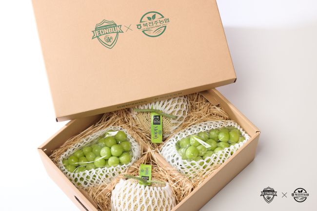 전북현대가 지역 파트너사 북전주농협 하나로마트와 협력해 특별한 선물세트를 출시했다. (전북현대 제공) (서울=뉴스1) 임성일 스포츠전문기자 = K리그1 전북현대가 지역 파트너사인 북전주농협 하나로마트와 협력해 추석맞이 '프리미엄 선물 세트'를 출시한다고 15일 밝혔다. 선물 세트는 멜론 2통(각 2kg 내외)과 샤인머스캣 2송이(각 800g 내외)로 구성된