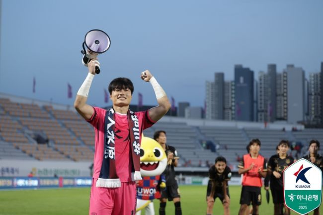 수원FC 골키퍼 황재윤이 21일 수원종합운동장에서 강원전 승리 후 환호하고 있다.제공 | 한국프로축구연맹 [스포츠서울 | 축구팀] 수원FC의 연패를 끊은 주인공. 골키퍼 황재윤(22)이다. 스포츠서울은 ‘하나은행 K리그1 2025’ 30라운드 ‘플레이어 오브 더 라운드(Player Of The Round)’에 황재윤을 선정했다. 황재윤은 21일 수원종합운동