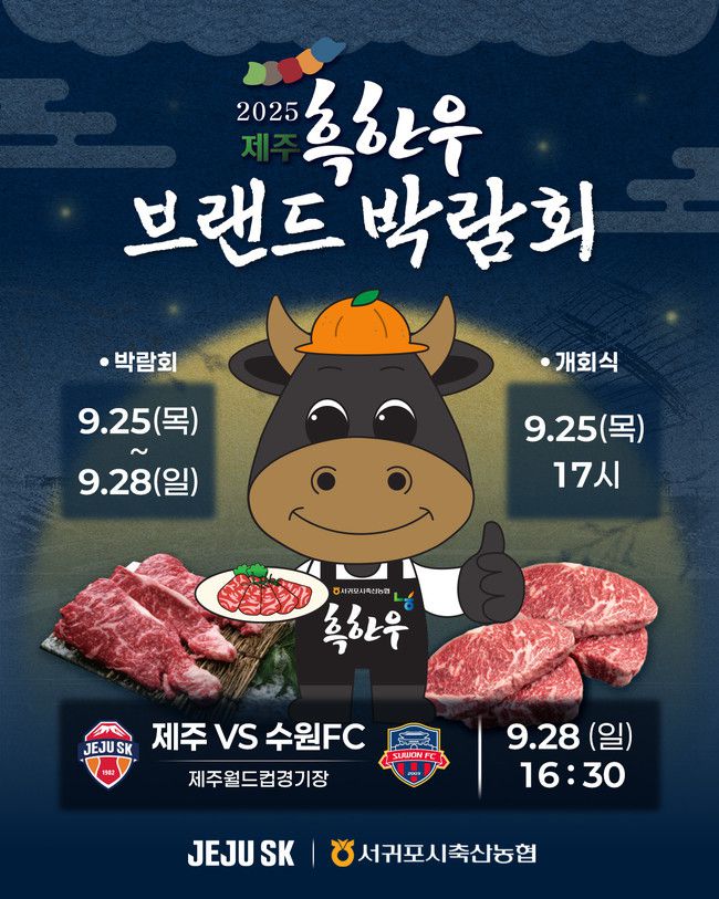 제주SK FC(이하 제주SK)가 '2025 제주 흑한우 브랜드 박람회'를 진행한다. '2025 제주 흑한우 브랜드 박람회'는 9월 25일(목)부터 9월 28일(일)까지 제주월드컵경기장 광장에서 열린다. 천연기념물 제546호로 지정된 제주 흑우의 우수성을 알리고, 대대적인 할인행사를 통한 소비촉진으로 축산업과 지역경제 활성화에 기여할 '2025 제주 흑한우