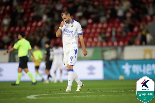 인천 무고사(한국프로축구연맹 제공) (서울=뉴스1) 안영준 기자 = 프로축구 K리그2 선두 인천 유나이티드와 2위 수원 삼성의 격차가 8점으로 좁혀졌다. 인천은 12일 탄천종합운동장에서 열린 성남FC와의 하나은행 K리그2 2025 34라운드 원정 경기에서 2-2로 비겼다. 선두를 달리고 있는 인천은 21승8무5패(승점 71)를 기록, 같은 날 승점 3점을