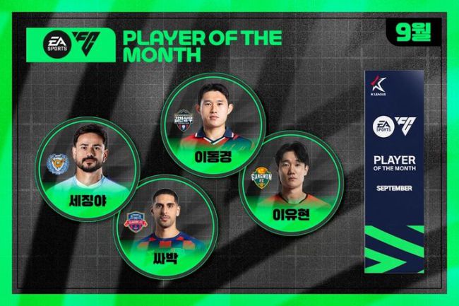 [서울=뉴시스] K리그1 2025시즌 9월 이달의 선수상 경쟁 후보 이미지. (사진=한국프로축구연맹 제공) *재판매 및 DB 금지 [서울=뉴시스] 김진엽 기자 = 프로축구 K리그를 총괄하는 한국프로축구연맹은 2025시즌 9월 'EA SPORTS 이달의 선수상'의 주인공을 선정하는 팬 투표가 오는 16일부터 19일까지 4일간 실시된다고 14일 알렸다. 'EA