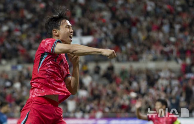 [서울=뉴시스] 김근수 기자 = 14일 오후 서울 마포구 서울월드컵경기장에서 열린 하나은행 초청 축구국가대표팀 친선경기 대한민국과 파라과이의 경기 시작 전반 대한민국 엄지성이 선취골을 뽑아내고 세리머니를 하고 있다. 2025.10.14. ks@newsis.com [서울=뉴시스]안경남 하근수 기자 = 축구 국가대표 윙어 엄지성(23)이 약 3년 9개월 만에