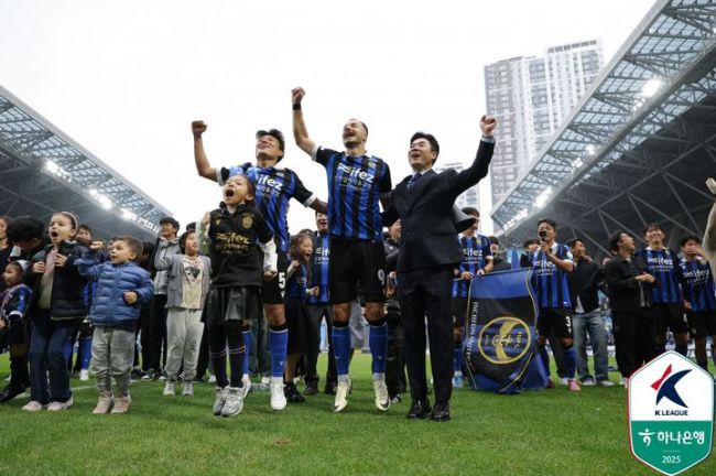 [서울=뉴시스] 프로축구 K리그2 인천유나이티드의 무고사와 윤정환 감독. (사진=한국프로축구연맹 제공) *재판매 및 DB 금지 [서울=뉴시스] 김진엽 기자 = 프로축구 K리그2 인천유나이티드가 K리그1 승격에 이어 연말 시상식 싹쓸이까지 노린다. 인천의 간판 공격수이자 몬테네그로 국가대표인 무고사는 28일 현재 20골로 하나은행 K리그2 2025 득점 선두