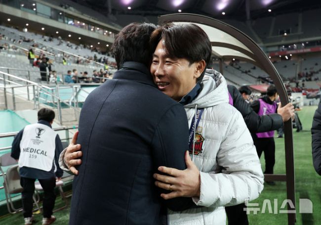 [서울=뉴시스] 조성우 기자 = 4일 오후 서울 마포구 서울월드컵경기장에서 열린 2025-2026 아시아축구연맹(AFC) 챔피언스리그 엘리트(ACLE) 리그 스테이지 4차전 FC서울과 청두 룽청의 경기, FC서울 김기동(오른쪽) 감독과 청두 서정원 감독이 포옹하고 있다. 2025.11.04. xconfind@newsis.com [사진 영상 제보받습니다] 공