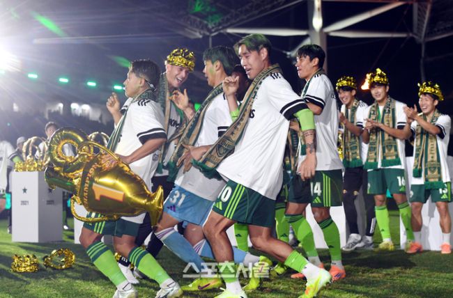 전북 현대의 이승우와 송범근, 송민규, 전진우(왼쪽부터)가 8일 전주월드컵경기장에서 열린 하나은행 K리그1 대전 하나 시티즌과 경기 후 진행된 우승 기념 행사에서 팬들 앞에서 춤을 추고 있다. 2025. 11. 8. 전주 | 박진업 기자 upandup@sportsseoul.com [기사제보 news@sportsseoul.com] Copyright ⓒ 스포츠
