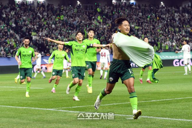 전북 현대의 이승우가 8일 전주월드컵경기장에서 열린 하나은행 K리그1 대전 하나 시티즌과 경기에서 추가골을 넣은 뒤 상의를 벗고 세리머니를 하고 있다. 2025. 11. 8. 전주 | 박진업 기자 upandup@sportsseoul.com [기사제보 news@sportsseoul.com] Copyright ⓒ 스포츠서울&sportsseoul.com