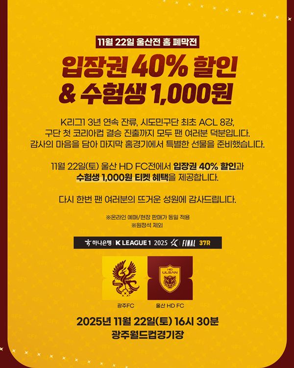 사진=광주FC 제공 프로축구 광주FC가 올해 마지막 홈경기를 기념해 팬 감사 특별 이벤트를 진행한다. 광주는 오는 22일 오후 4시 30분, 광주월드컵경기장에서 열리는 하나은행 K리그1 2025 37라운드 울산HD FC전을 홈 폐막전으로 치르며, 팬들의 뜨거운 성원에 보답하고자 입장권 40% 할인 이벤트를 실시한다고 밝혔다. 이번 행사는 광주FC의 3년 연
