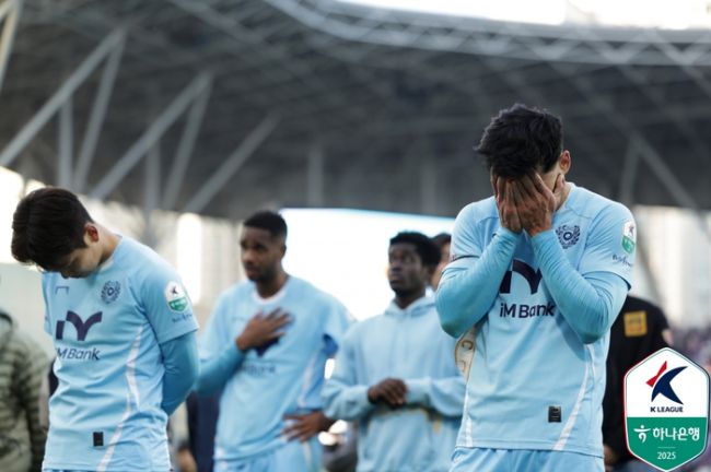 대구 선수들이 강등을 확정한 후 고개 숙이고 눈물을 보이고 있다. 사진 | 한국프로축구연맹 대구FC 응원가 ‘그 겨울’이 이날만큼은 처연하게 울려 퍼졌다. 김병수 감독이 이끄는 대구는 지난달 30일 대구iM뱅크파크에서 열린 FC안양과 ‘하나은행 K리그1 2025’ 최종 38라운드에서 2-2 무승부를 거뒀다. 대구(승점 34)는 같은 시간 울산 HD를 꺾은