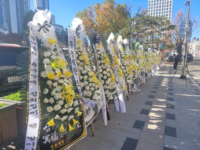 시청 앞 근조화환 100여개 보내 항의성 메시지 전달…쇄신 요구 5일 프로축구단 대구FC가 K리그2로 강등되자 축구팬들이 대구시청 동인청사 앞에 근조화환을 보내며 항의 시위를 하고 있다. 시민 프로축구단인 대구FC가 올 시즌 최하위를 기록해 내년부터 K리그2로 강등되자 화난 축구팬들이 대구시청 앞에 근조화환을 보내며 항의 시위를 벌였다. 5일 오전 대구시청
