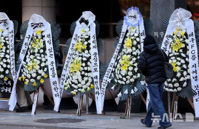 [대구=뉴시스] 이무열 기자 = 5일 대구 중구 대구시청 동인청사 앞에 대구 프로축구단 대구FC의 정상화를 요구하는 취지의 근조화환이 놓여져 있다. 대구FC가 10년 만에 강등된 가운데 팬 서포터즈 연대 ‘그라지예’는 축구단을 둘러싼 각종 논란에 대한 쇄신을 요구하는 근조화환 시위를 벌이고 있다. 2025.12.05. lmy@newsis.com [서울·대구