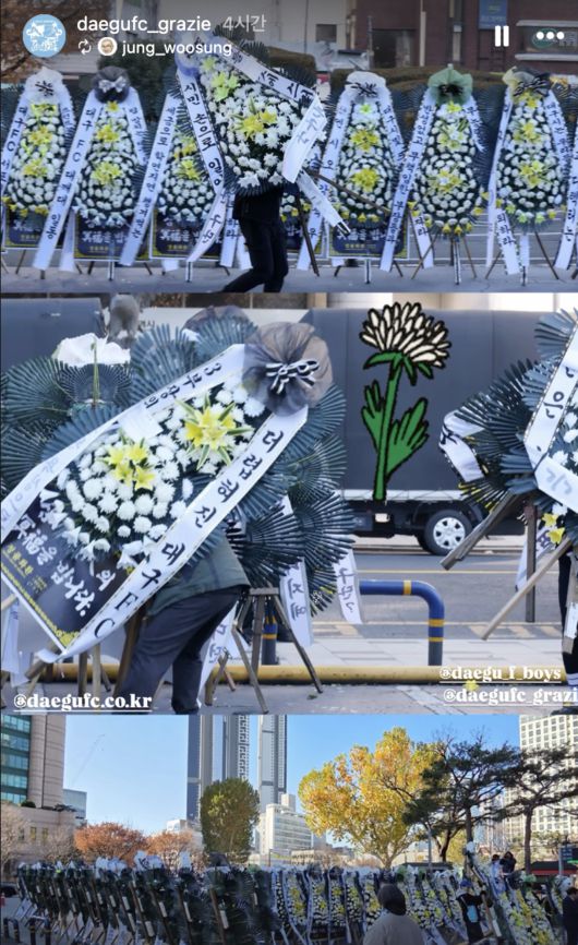 [사진] 그라지예 소셜 미디어 계정 대구FC가 2부리그로 강등 확정된 가운데, 홈 팬들의 분노가 정점에 달했다. 서포터즈 ‘그라지예’는 책임 있는 변화가 필요하다며 근조화환 시위를 벌였다. 5일 대구 중구 대구시청 동인청사 앞에는 100여 개의 근조화환이 줄지어 놓였다. ‘대구시는 무책임했나’, ‘시도 공범이다’, ‘대구FC는 시민의 구단이다’ 같은 문구가