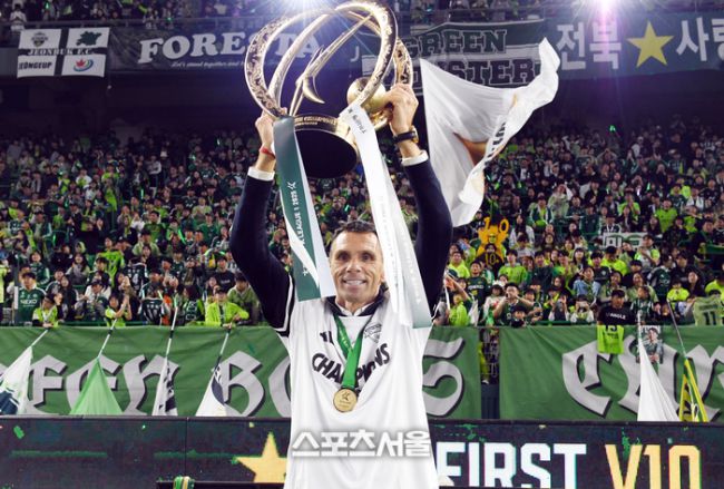 전북 현대 거스 포옛 감독이 8일 전주월드컵경기장에서 열린 하나은행 K리그1 대전 하나 시티즌과 경기 후 진행된 우승 시상식에서 트로피를 들어올리며 취재진을 향해 포즈를 취하고 있다. 2025. 11. 8. 전주 | 박진업 기자 upandup@sportsseoul.com ‘더블’ 혹은 ‘최초’. 거스 포옛 감독이 이끄는 전북 현대와 이정효 감독의 광주FC는