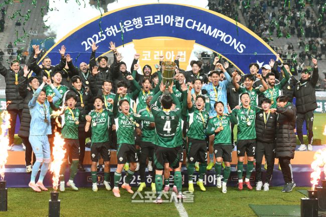 전북 현대 주장 박진섭과 선수들이 6일 서울월드컵경기장에서 열린 2025 하나은행 코리아컵 광주FC와의 결승전에서 2-1로 승리하며 우승을 차지한 뒤 트로피를 들어올리며 기뻐하고 있다. 전북은 K리그1에 이어 코리아컵까지 우승하며 더블을 달성했다. 2025. 12. 6. 박진업 기자 upandup@sporttsseoul.com [기사제보 news@sport