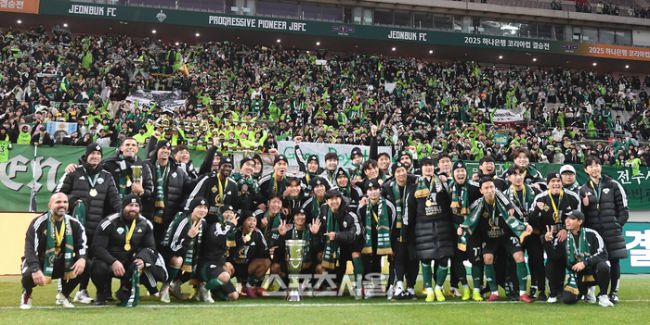 전북 현대 선수단이 6일 서울월드컵경기장에서 열린 2025 하나은행 코리아컵 광주FC와의 결승전에서 2-1로 승리하며 우승을 차지한 뒤 팬들을 배경으로 기념촬영을 하고 있다. 전북은 K리그1에 이어 코리아컵까지 우승하며 더블을 달성했다. 2025. 12. 6. 박진업 기자 upandup@sporttsseoul.com [기사제보 news@sportsseoul