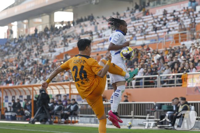 (제주=뉴스1) 박정호 기자 = 7일 오후 제주 서귀포시 월드컵로 제주월드컵경기장에서 열린 하나은행 K리그 승강 플레이오프 2025 2차전 제주SK와 수원삼성의 경기에서 수원 파울리뇨가 볼을 걷어내는 제주 임채민을 막아서고 있다. 2025.12.7/뉴스1 pjh2035@news1.kr Copyright ⓒ 뉴스1. All rights reserved. 무단
