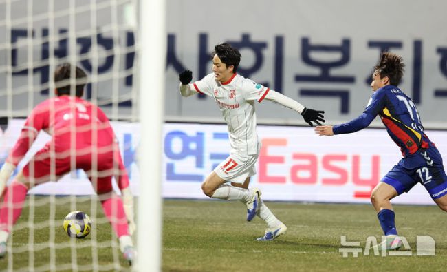 [수원=뉴시스] 이영환 기자 = 8일 오후 수원 장안구 수원종합운동장에서 열린 K리그1 수원FC와 K리그2 부천FC의 승강 플레이오프(PO) 2차전 경기 전반전, 부천 김규민이 골을 넣고 있다. 2025.12.08. 20hwan@newsis.com [사진 영상 제보받습니다] 공감언론 뉴시스가 독자 여러분의 소중한 제보를 기다립니다. 뉴스 가치나 화제성이 있