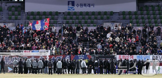 (수원=뉴스1) 구윤성 기자 = 8일 오후 경기 수원시 장안구 수원종합경기장에서 열린 하나은행 K리그 승강 플레이오프(PO) 2차전 수원FC와 부천FC의 경기, 부천FC에 2대 3으로 패하며 강등을 확정 지은 수원FC 코칭스태프들이 서포터즈 앞에서 사과를 하고 있다. 2025.12.8/뉴스1 kysplanet@news1.kr Copyright ⓒ 뉴스1.