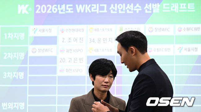 2026년도 WK리그 신인선수 선발 드래프트가 서울 송파구 올림픽파크텔에서 열렸다. 드래프트 지명은 매 라운드 당해 연도 리그 구단 성적순으로 추첨해 순서를 선정한다. 서울시청 유영실 감독이 3차 지명 순서를 추첨 중인 가운데, 1차지명 1번 순서인 서울시청의 지명란을 포함해 지명을 포기한 여러 구단들의 지명란이 비어 있다.. 2025.12.10 /cej@