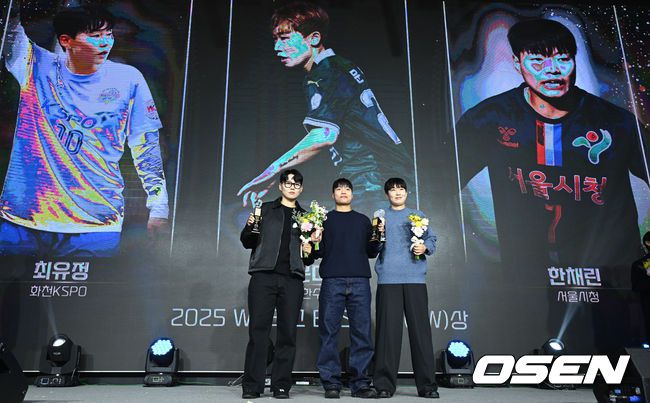 2025 한국여자축구연맹 시상식이 10일 서울 송파구 올림픽파크텔에서 열렸다. 시상식에서는 2025년 시즌 WK리그를 빛낸 선수들을 대상으로 베스트 11, 최다 득점상, 최다 도움상, 최우수선수(MVP)를 발표한다. 베스트11 FW 부문을 수상한 화천KSPO 최유정(왼쪽부터), 경주한수원 문미라, 서울시청 한채린이 포즈를 취하고 있다. 2025.12.10