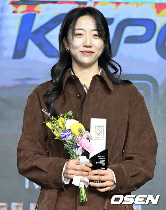 2025 한국여자축구연맹 시상식이 10일 서울 송파구 올림픽파크텔에서 열렸다. 시상식에서는 2025년 시즌 WK리그를 빛낸 선수들을 대상으로 베스트 11, 최다 득점상, 최다 도움상, 최우수선수(MVP)를 발표한다. MVP를 수상한 화천KSPO 정지연이 포즈를 취하고 있다. 2025.12.10 /cej@osen.co.kr
