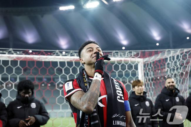 (서울=뉴스1) 박정호 기자 = 10일 오후 서울시 마포구 월드컵로 서울월드컵경기장에서 열린 AFC 챔피언스리그 엘리트(ACLE) 2025/26 리그 스테이지 6차전 FC서울과 멜버른시티FC의 경기 종료 후 진행된 환송행사에서 서울 린가드가 서포터즈 수호신과 함께 세리머니를 하고 있다. 2025.12.10/뉴스1 pjh2035@news1.kr Copyrig