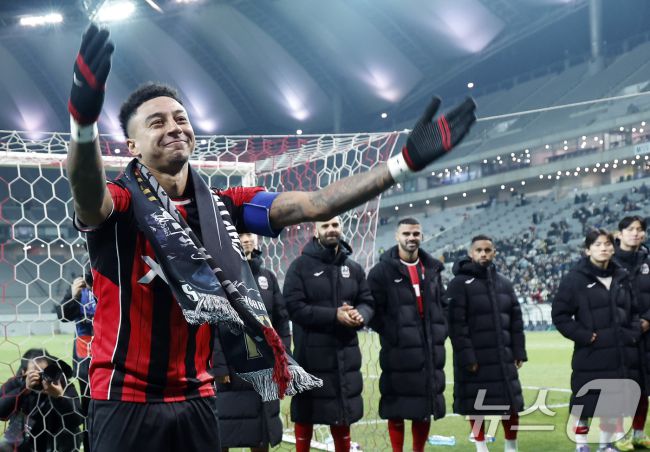10일 오후 서울시 마포구 월드컵로 서울월드컵경기장에서 열린 AFC 챔피언스리그 엘리트(ACLE) 2025/26 리그 스테이지 6차전 FC서울과 멜버른시티FC의 경기 종료 후 진행된 환송행사에서 서울 린가드 서포터즈 수호신과 함께 세리머니를 하고 있다. 2025.12.10/뉴스1 ⓒ News1 박정호 기자 10일 서울 마포구 월드컵로 서울월드컵경기장에서 열