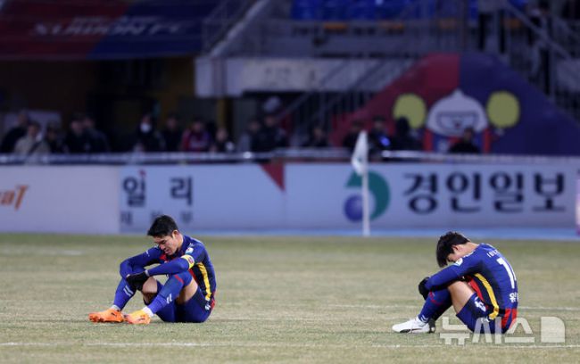 [수원=뉴시스] 이영환 기자 = 지난 8일 오후 수원 장안구 수원종합운동장에서 열린 K리그1 수원FC와 K리그2 부천FC의 승강 플레이오프(PO) 2차전 경기 후반전 추가시간 비디오 판독 중인 가운데 수원 선수들이 그라운드에 앉아 있다. 2025.12.08. 20hwan@newsis.com [서울=뉴시스] 김진엽 기자 = 프로축구 K리그2로 강등된 수원FC