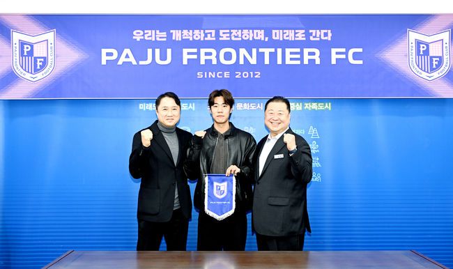 파주 프런티어 FC가 구단의 미래를 책임질 ‘1호 영입 선수’로 공격수 이준석을 낙점하고 계약을 완료했다. 파주 프런티어 FC는 22일 오전 파주시청 접견실에서 김경일 구단주, 김정열 이사장, 황보관 단장 등 구단 주요 관계자들이 참석한 가운데 이준석의 입단식을 진행했다. 이번 영입은 ‘젊음’과 ‘성장성’을 구단 정체성으로 삼은 파주 프런티어 FC의 첫 번