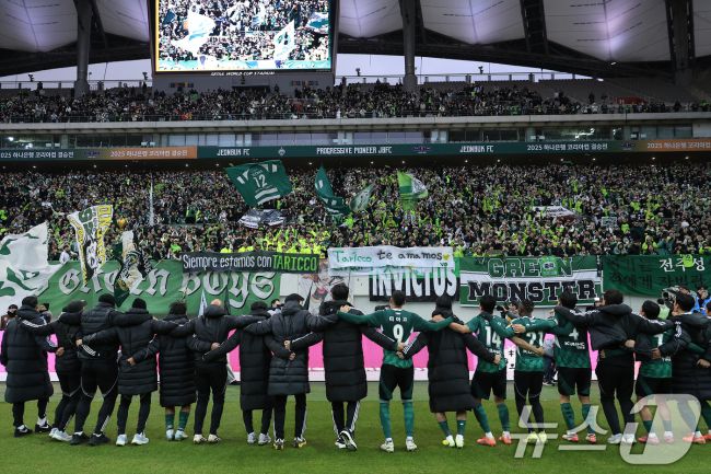 2025년 2관왕을 달성한 전북 현대. /뉴스1 ⓒ News1 박정호 기자 (서울=뉴스1) 김도용 기자 = 2025년 우승 트로피 2개를 들어 올리며 최고의 시즌을 보낸 전북 현대가 대대적인 변화를 앞두고 있다. 정정용 감독으로 이미 사령탑을 바꾼 가운데 2025년 더블의 주역 일부도 팀을 떠날 조짐이다. 지난해 K리그1 10위에 그쳐 승강 플레이오프를 거