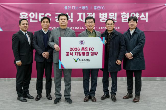 사진=용인FC 제공 프로축구 K리그2 용인FC가 의료법인 영문의료재단 다보스병원과 손잡았다. 용인은 지난 6일 “다보스병원과 공식 지정병원 협약 및 광고 후원 계약을 체결했다”고 밝혔다. 이번 협약을 통해 다보스병원은 2026~2027시즌 동안 용인FC의 공식 지정병원(종합병원)으로 참여해 선수단 의료 지원과 구단 운영 전반에 협력하게 된다. 다보스병원은