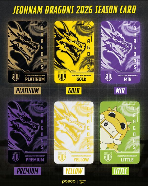 사진=전남 드래곤즈 제공 전남드래곤즈가 2026시즌 홈경기 관람의 감동을 선사할 시즌권 판매를 시작한다. 이번 2026 시즌권은 차감형 카드 형태로, K리그2와 코리아컵을 포함하여 총 16회의 홈경기를 관람할 수 있다. 권종은 좌석 구역 및 혜택에 따라 플래티넘, 프리미엄, 골드, 옐로우, 미르, 리틀 등 6개로 세분화되어 운영된다. 플래티넘 구매자는 광양