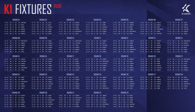 사진 | 한국프로축구연맹 한국프로축구연맹은 2026시즌 K리그1 정규라운드 1~33라운드 일정을 발표했다. 2026시즌 K리그1엔 ‘디펜딩 챔프’ 전북을 비롯해 승격팀 인천과 부천 등 12개 팀이 참가한다. 정규라운드는 팀당 33경기씩 총 198경기다. 2026시즌 K리그1의 포문을 여는 경기는 2월 28일 오후 2시 인천축구전용경기장에서 열리는 인천과 서