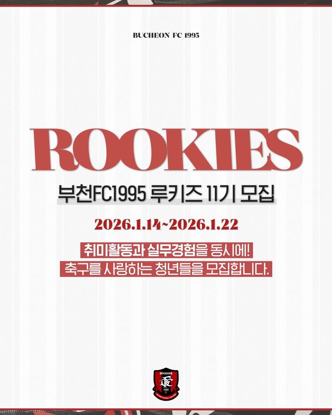 부천FC1995(구단주 조용익 부천시장, 이하 부천)가 청년 크리에이터 루키즈(이하 루키즈) 11기를 모집한다. 부천FC1995 청년 크리에이터 루키즈는 스포츠 산업 진로를 꿈꾸는 청년들의 취업 지원 및 직업체험 제공을 목적으로 진행하는 구단의 스포츠 인재 양성 사업이다. 이번 루키즈 11기는 홈경기를 비롯한 구단의 공식 행사 지원을 담당하는 '루키즈 프런