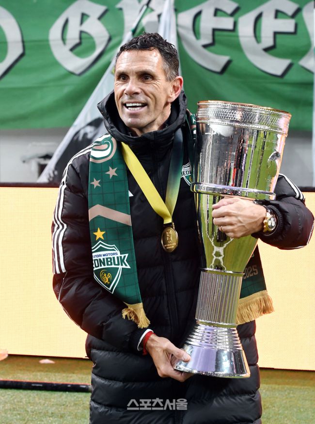전북 현대 거스 포옛 감독이 6일 서울월드컵경기장에서 열린 2025 하나은행 코리아컵 광주FC와의 결승전에서 2-1로 승리하며 우승을 차지한 뒤 트로피를 들고 기념촬영을 하고 있다. 전북은 K리그1에 이어 코리아컵까지 우승하며 더블을 달성했다. 2025. 12. 6. 박진업 기자 upandup@sporttsseoul.com 갑작스럽게 전북 현대를 떠난 거스