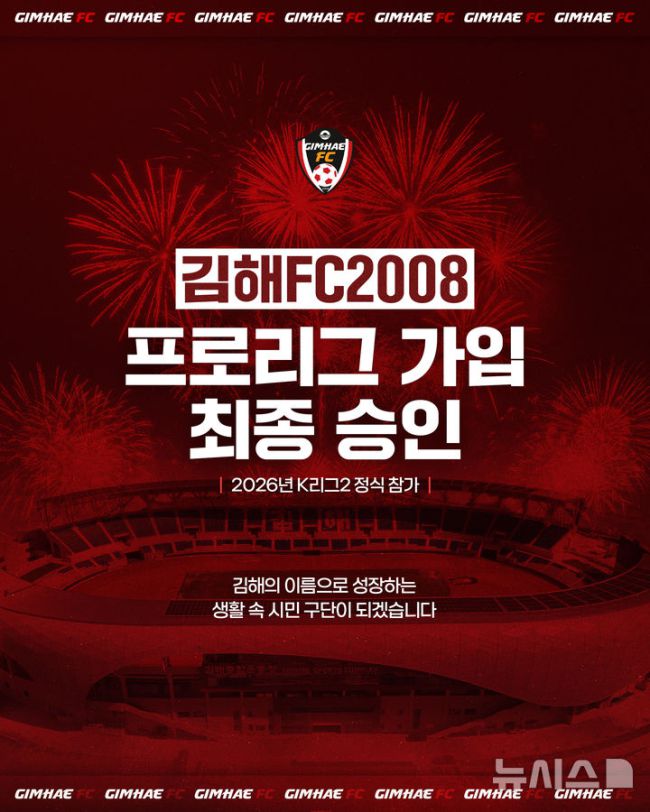 [김해=뉴시스]김해FC, K리그2 진출. (사진=김해시 제공). 2026.01.17. photo@newsis.com [김해=뉴시스] 김상우 기자 = 김해FC가 K리그2 진출이 최종 확정됐다. 16일 열린 한국프로축구연맹 2026 K리그 정기 대의원 총회에서 김해FC의 프로리그 가입이 최종 승인됐다. 이에 이번 시즌 K리그2는 신규 가입 3팀(김해, 용인,