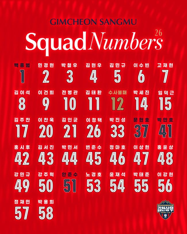 김천상무가 2026시즌 프로선수단 배번을 공개했다. 김천상무프로축구단(대표이사 이재하)이 1월 20일, 2026시즌 K리그에 참가하는 선수단의 배번을 공개했다. 올 시즌 배번에는 많은 변화가 있다. 맏형 박철우는 왼쪽 풀백의 상징인 3번을 선택했다. 7번의 계보는 고재현이 이어간다. 미드필더의 상징 8번은 김이석이 차지한다. 이건희는 공격수를 상징하는 9번