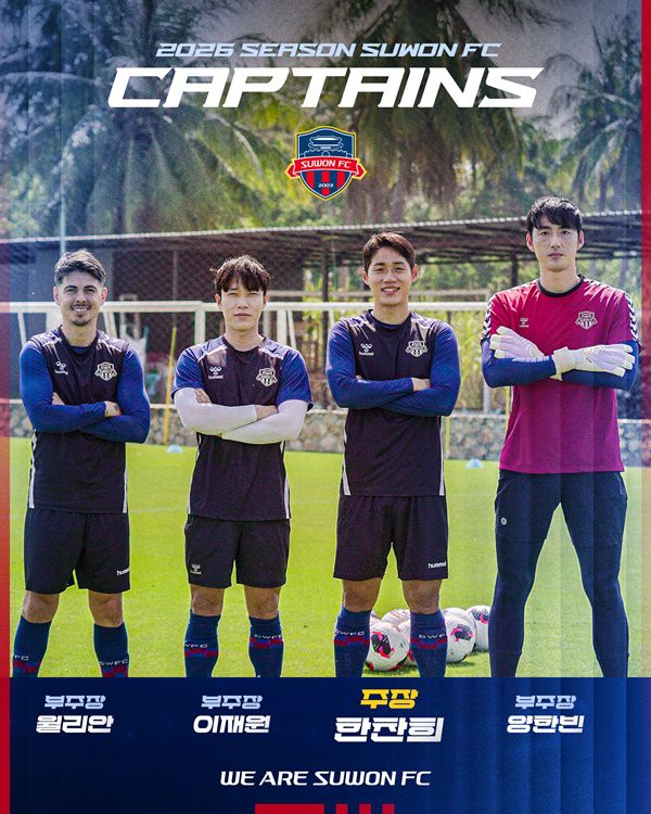 사진=수원FC 제공 수원FC가 2026시즌을 이끌 주장단 구성을 확정했다. 주장에는 미드필더 한찬희가 선임됐으며, 부주장으로는 골키퍼 양한빈, 공격수 윌리안, 미드필더 이재원이 함께한다. 주장 완장을 찬 한찬희는 지난 여름 합류해 팀의 중심을 잡아온 중원 자원으로, 재계약 이후 선수단의 신뢰를 바탕으로 리더 역할을 맡게 됐다. 부주장단에는 선수단의 맏