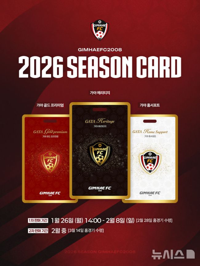 [김해=뉴시스]김해FC, K리그2 진출 시즌티켓 판매. (사진=김해FC 제공). 2026.01.26. photo@newsis.com [김해=뉴시스] 김상우 기자 = K리그2 정식 참가가 확정된 김해FC는 2026년 시즌권 판매를 26일 발표했다. 티켓은 시즌권 1종, 멤버십 2종으로 구성됐다. 김해FC의 홈에서 개최되는 모든 경기를 관람할 수 있는 입장티켓